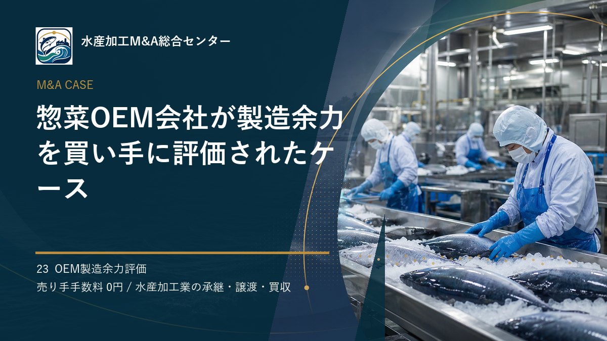本事例では、水産惣菜OEM会社のOEM製造余力評価をテーマに、売り手企業が早い段階で整理しておきたい実務上の論点をまとめます。水産加工業は、原料調達、衛生管理、冷凍・冷蔵設備、熟練人材、地域の取引関係が一体となって価値をつくる業種です。決算書の数字だけでは伝わらない強みをどう言語化し、買い手候補である総菜メーカーへどう届けるかが、納得感のあるM&Aの出発点になります。