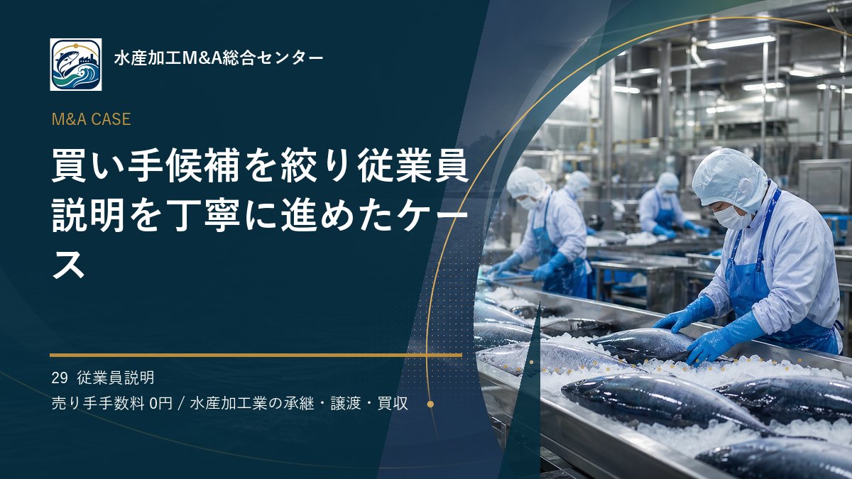 本事例では、中規模加工会社の従業員説明をテーマに、売り手企業が早い段階で整理しておきたい実務上の論点をまとめます。水産加工業は、原料調達、衛生管理、冷凍・冷蔵設備、熟練人材、地域の取引関係が一体となって価値をつくる業種です。決算書の数字だけでは伝わらない強みをどう言語化し、買い手候補である食品グループへどう届けるかが、納得感のあるM&Aの出発点になります。